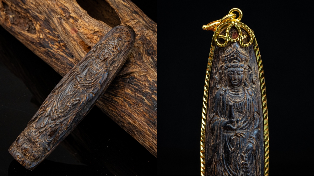 - Hình ảnh Quán Thế Âm Bồ Tát được lòng của nhiều người trong Phật Giáo ngày nay vì ý nghĩa về sự Từ Bi với chúng sinh thật là lớn lao . Cũng vì vậy mà hình tướng Quan Âm được khắc họa khá nhiều tranh vẽ , tượng trưng bày hoặc thờ cúng , tác phẩm nghệ thuật mang tính chất nuôi dưỡng tâm hồn . Những mặt dây chuyền trầm hương được tinh tuyển từ nguyên liệu trầm chìm cao cấp nhất , cứng chắc , hương thơm ngọt sâu rất tốt . Qua bàn tay điêu luyện và thiện xảo của nghệ nhân Phúc Kiến lẫy lừng trong điêu khắc diện Phật - Bồ Tát trên trầm hương , từng đường vân dầu được gọt tỉa , truyền thần và độ sắc nét cực cao lên từng thớ dầu trầm tràn đầy quý giá .